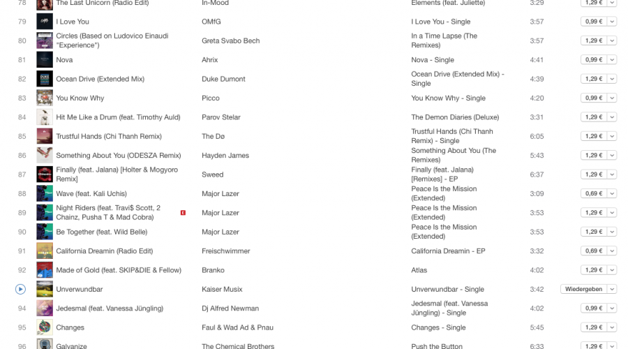 Am 1. Dezember ist der Song erschienen und noch am selben Tag kam er bei iTunes im Genre Electronic bis auf Platz 93 in Deutschland. Durch eure Hilfe sind wir mit dem Song an 3 Tagen hinereinander mehrere Stunden in die Top 200 gekommen. Das ist doch mal was ;-).
