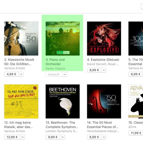 Am Freitag den 9. März habe ich Platz 3 der Top-Alben unter iTunes-Klassik erreicht! Am 08.03.2018 kam meine neue Klassische Filmmusik CD Piano und Orchester von kaiser-klassix raus und einen Tag später ist sie in die Top 10 der Album Charts in der Rubrik Klassik bei iTunes eingestiegen. Jeahh! Es ist mir eine große Ehre ... weiterlesen